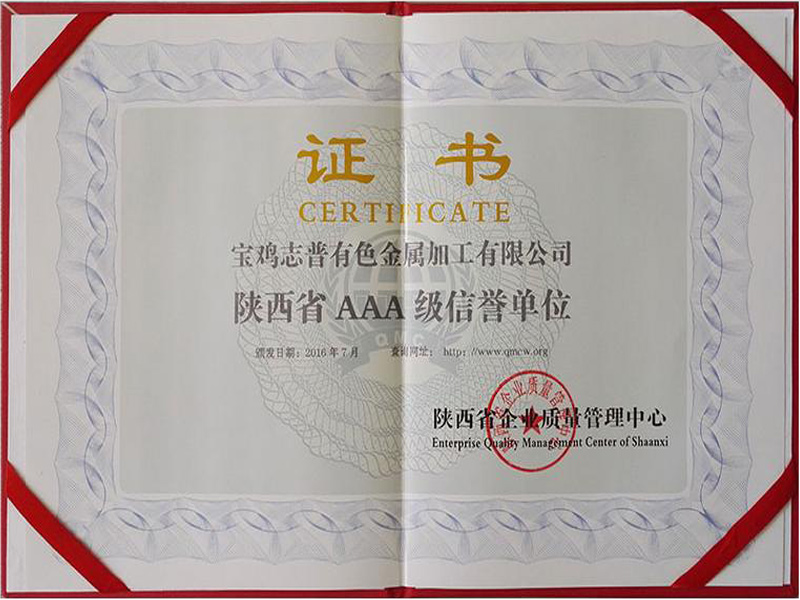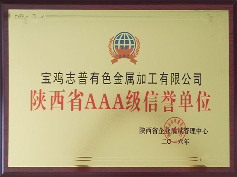 2016年7月,寶雞志普有色金屬加工有限公司被陜西省質(zhì)量管理中心授予陜西省AAA級信譽(yù)單位。